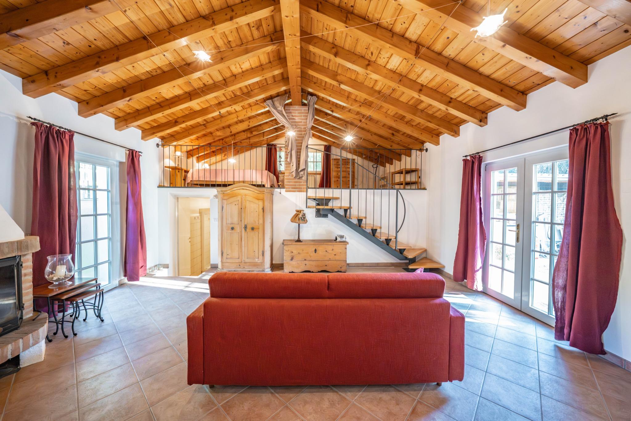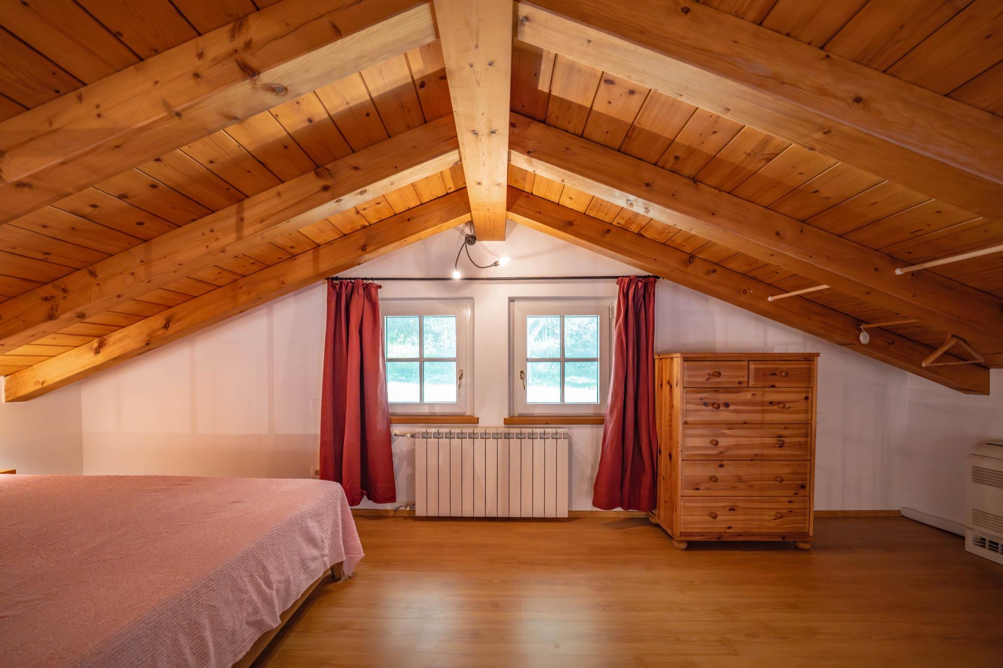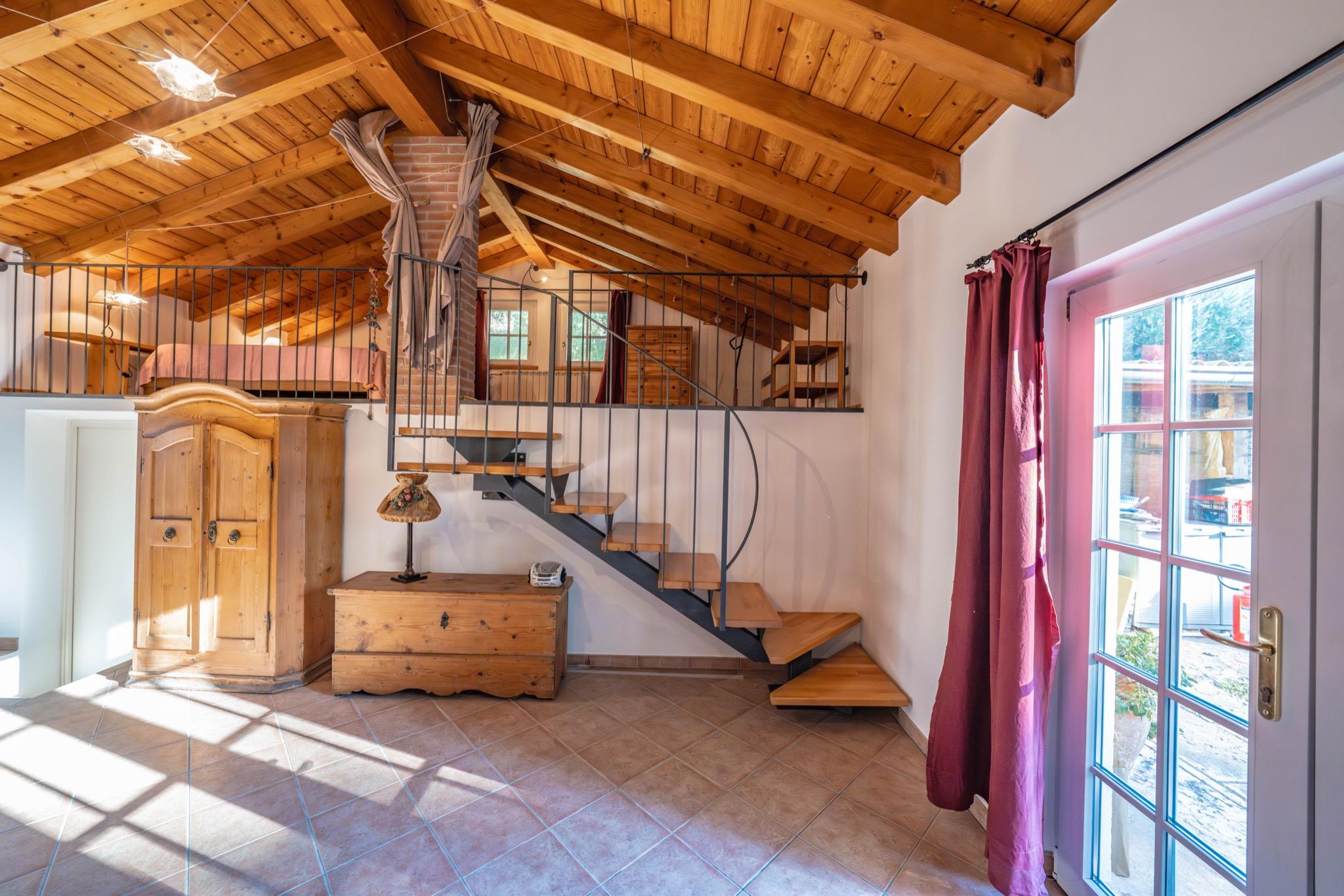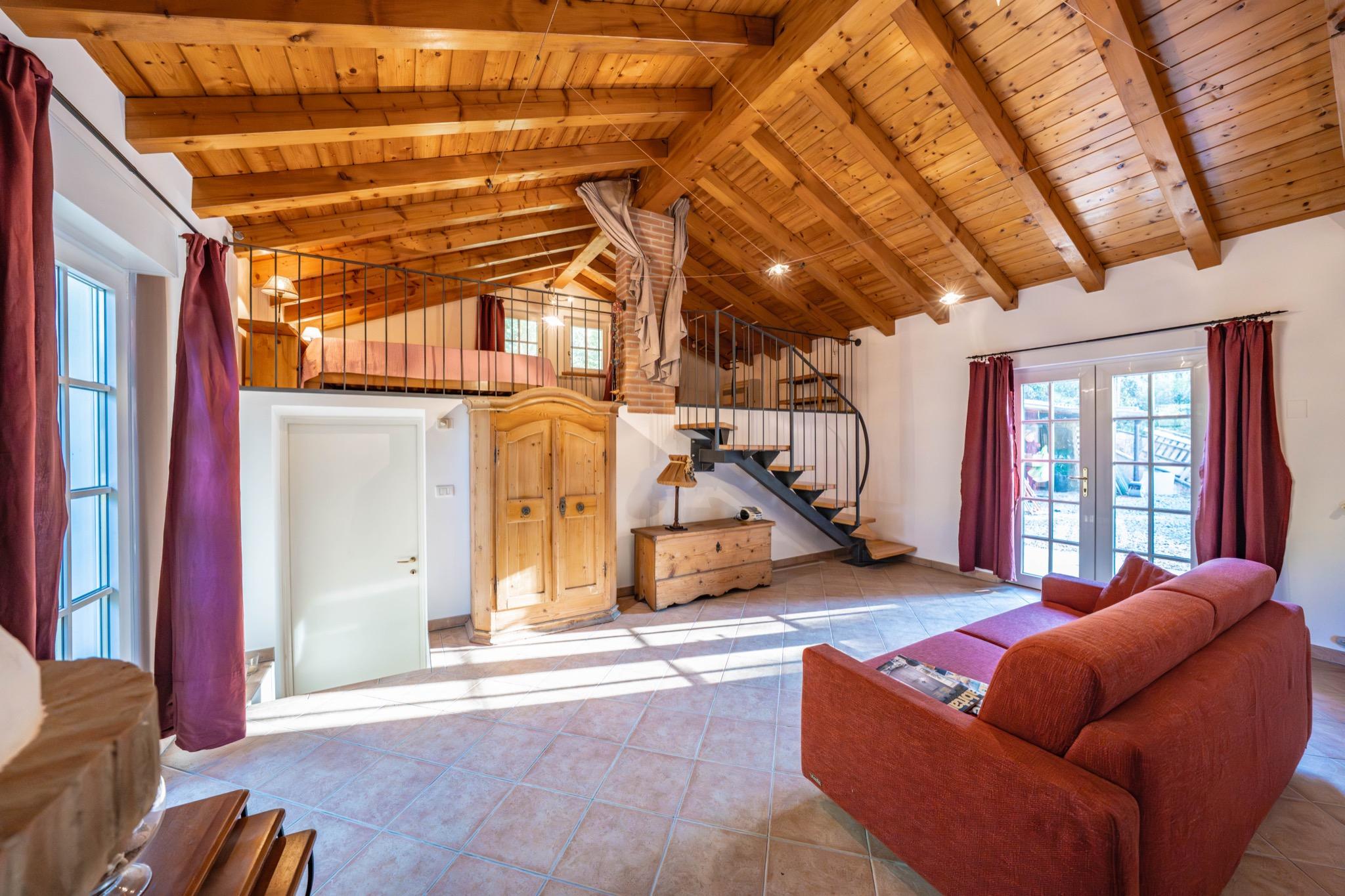 - Spacious studio with mezzanine: Open-plan layout with a cozy double bed on the mezzanine under a charming sloped wooden ceiling.