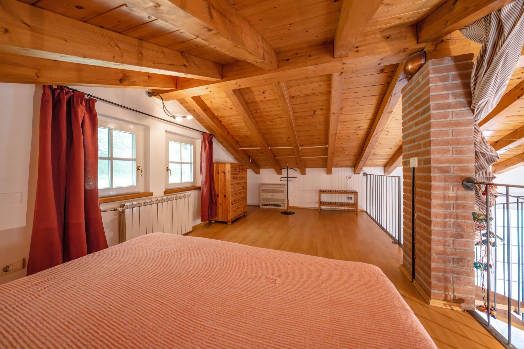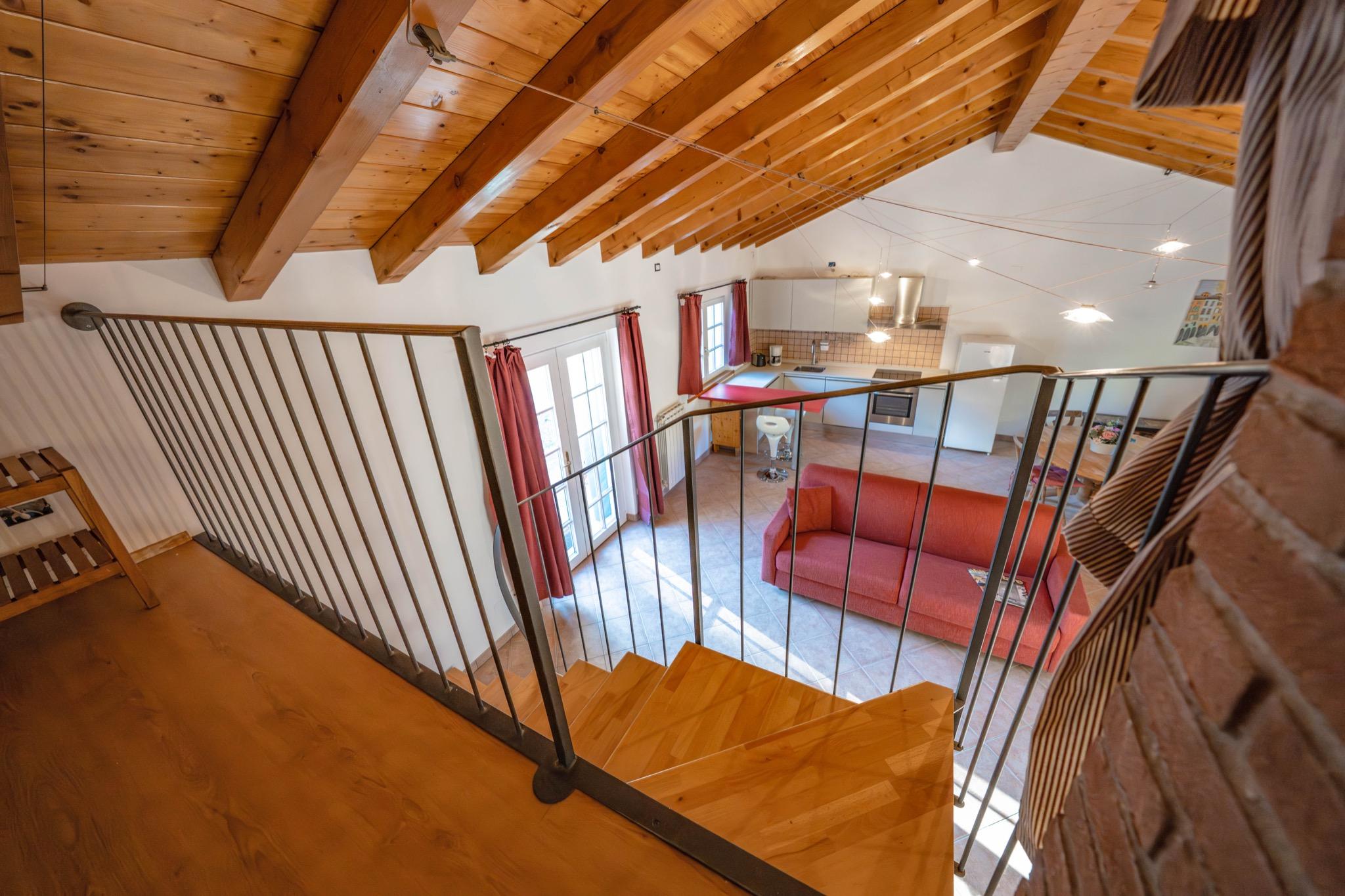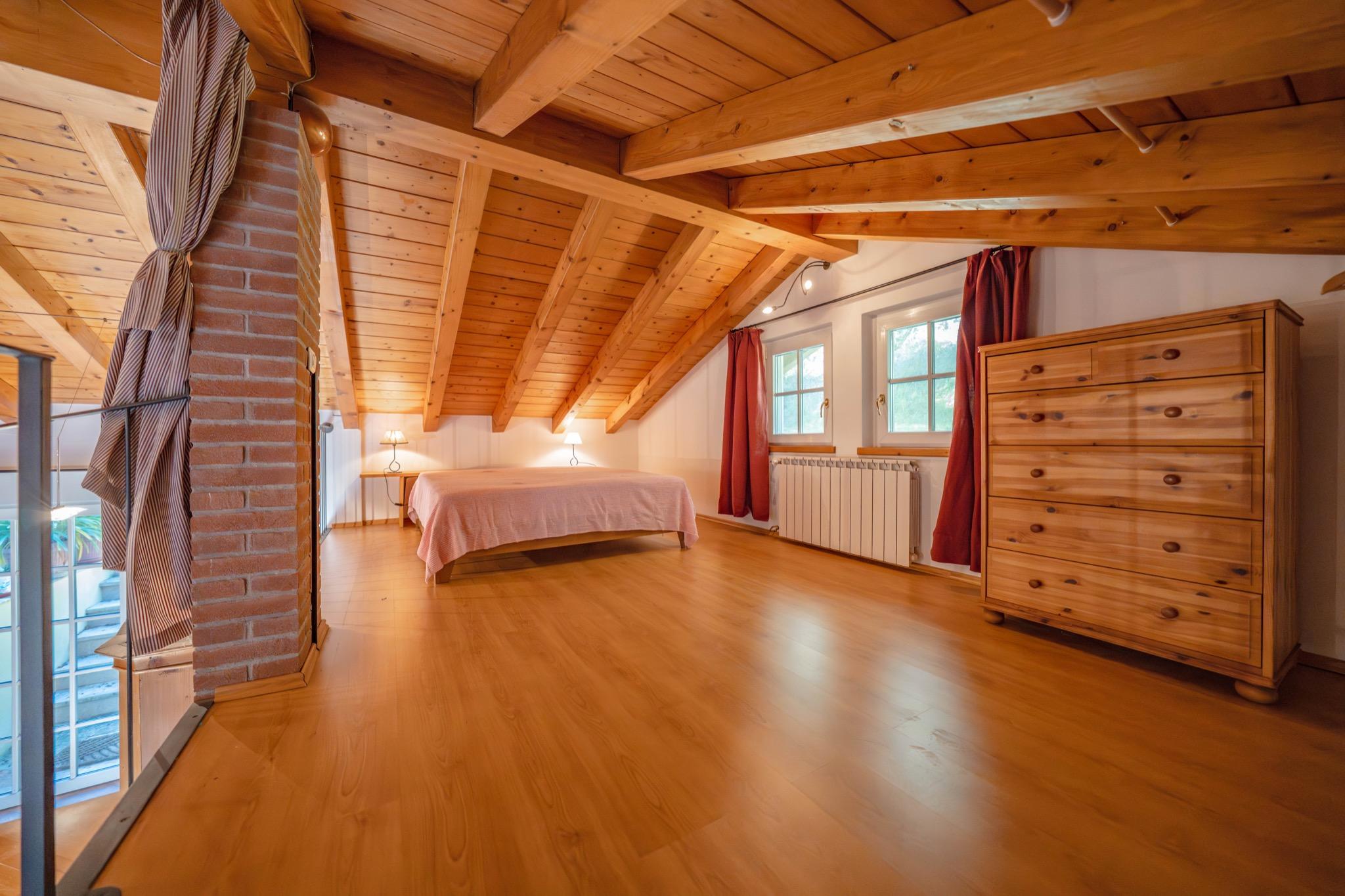 - Spacious studio with mezzanine: Open-plan layout with a cozy double bed on the mezzanine under a charming sloped wooden ceiling.